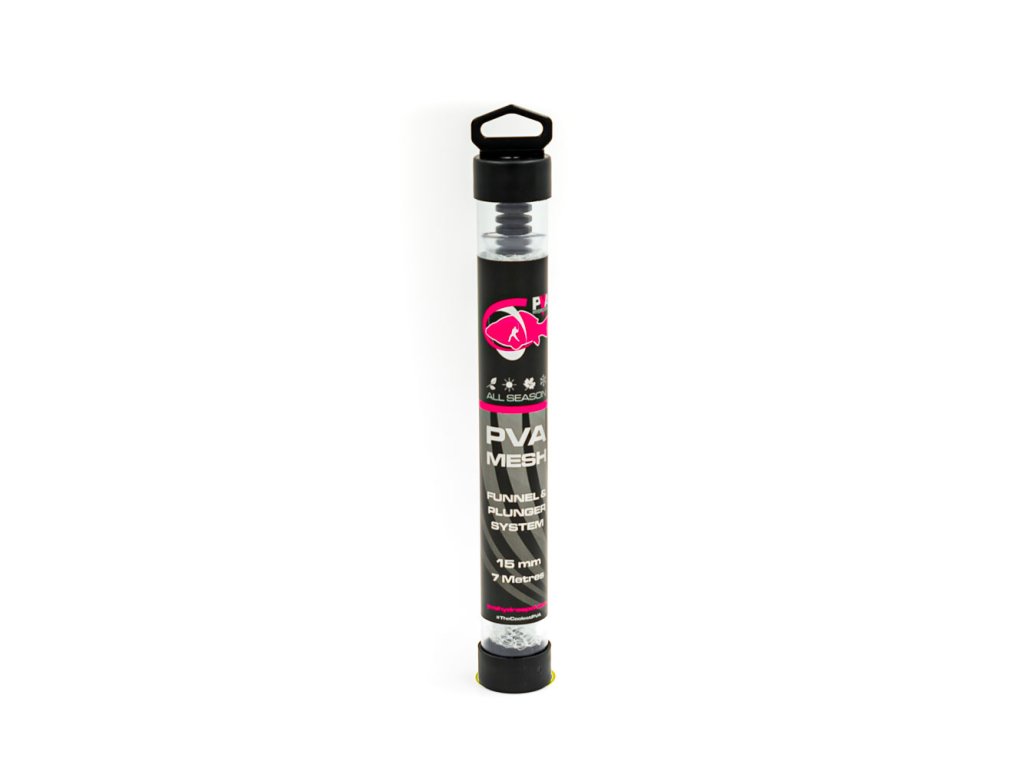 Prvotřídní PVA punčocha včetně tubusu a pěchovače. Evropský výrobce PVA produktů společnost PVA Hydrospol Vám přináší klasický systém 15 mm s micro-mesh síťkou. Všechny naše punčochy jsou pletené z kvalitních japonských vláken formou hustého micro-meshe. Průměr 15 mm je vytvořen z 26 PVA vláken. Naše punčochy můžete plnit sypkými materiály nebo drobnými peletami, aniž by vám zvolená směs propadávala úpletem punčochy. Čas rozpustnosti závisí na teplotě vody. V teplé vodě se doba rozpadu pohybuje okolo 45 sekund, naopak v ledové vodě to může být až 8 minut. Veškerý náš PVA program je vhodný pro celoroční použití.