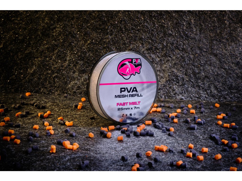 Společnost PVA Hydrospol Vám přináší novou řadu punčoch s označením Fast Melt, přesněji náhradní punčochu 25 mm s návinem 7 m. PVA náhrady jsou vhodné k doplnění punčochy na prázdný tubus. Jak název napovídá jedná se o rychlorozpustnou verzi punčochy. Jako výrobci PVA produktů jsme usilovně pracovali na variantě punčoch, která zvládne plnit hned několik vlastností najednou. Pro výrobu nové punčochy jsme opět zvolili kvalitní japonská vlákna, která mají poloviční čas rozpadu oproti vláknům v naší klasické verzi. Zakládáme si na kvalitě, ale i stylu pletení punčoch, naši zákazníci se mohou znovu těšit na hustý micro-mesh, do kterého lze plnit drobné krmeni, sypké materiály a použít ji tak může opravdu každý rybář. Díky zvolenému úpletu můžete PVA punčochy Fast melt používat dokonce i v teplých vodách. To z ní dělá skvělou punčochu pro celoroční použití.