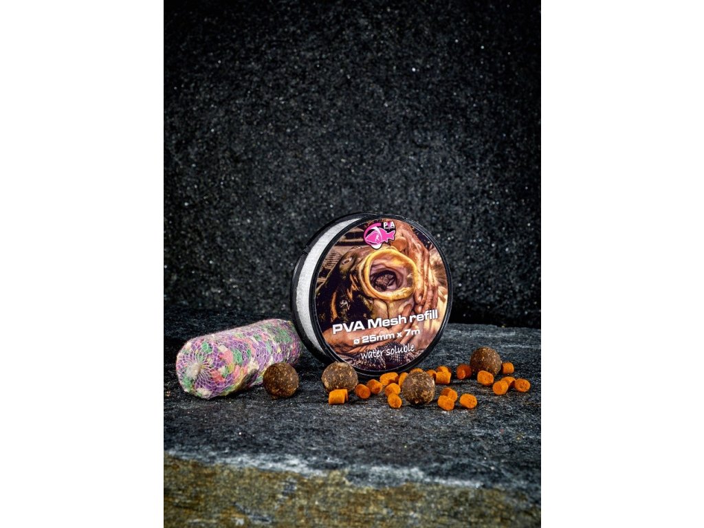 Náhradní PVA micro-mesh punčocha v průměru 25 mm a návinu 7 m je pletená z kvalitních japonských vláken formou hustého micro-meshe. PVA náhrady jsou vhodné k doplnění punčochy na prázdný tubus. Průměr 25 mm je pleten z 26 PVA vláken. Naše punčochy můžete plnit sypkými materiály nebo drobnými peletami, aniž by Vám zvolená směs propadávala úpletem. Čas rozpustnosti závisí na teplotě vody. V teplé vodě se doba rozpadu pohybuje okolo 45 sekund, naopak v ledové vodě to může být až 8 minut. Veškerý náš PVA program je vhodný pro celoroční použití.