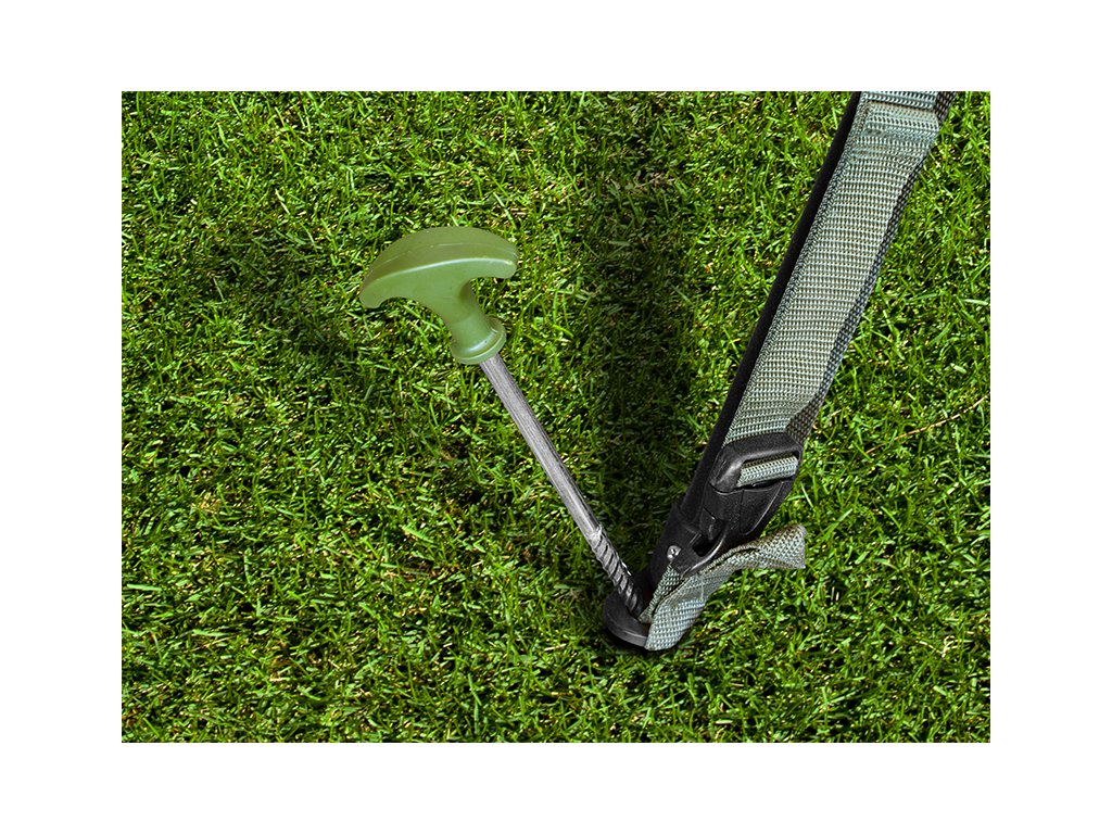 Set obsahující 10 pevných, kovových kolíků s kladivem v praktickém pouzdru s C2G designem. Kolíky disponují plně uzavřenými plastovými hlavami zelené barvy, jejichž výhodou je, že se ani po delší době zabíjení do země nezačnou uvolňovat a sesouvat po kovové části směrem dolů. Vrták s odolným čtyřhranným hrotem napomáhá jednoduššímu zapíchnutí do tvrdé a suché půdy. Hroty jsou při koupi opatřeny transparentními ochrannými krytkami pro zvýšení bezpečnosti. Součástí balení je také pryžové kladivo s kovovou nohou a gumovou rukojetí černé barvy, sloužící pro snazší zabití kolíků do země. Samotné pouzdro je vyrobeno z odolné tkaniny, která je z vnitřní strany pogumovaná. Kladivo i kolíky jsou v pouzdru během transportu fixovány, takže nehrozí nechtěná ztráta kterékoli součásti balení. Technické parametry: Rozměry pouzdra: 27x22cm Délka kolíků: 20 cm Délka závitu: 7 cm Průměr ocelové tyče: 7 mm Počet kusů v balení: 10Doplňkové parametry