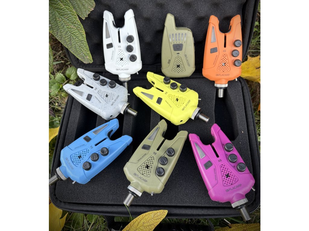Limitovaná edice FLACARP X8 + RX8 spojuje špičkové české signalizátory záběru s bezdrátovým příposlechem RX8 do dokonale sladěné sady – nyní v osmi atraktivních barevných variantách: modrá, žlutá, oranžová, khaki, šedá, šedý granit, bílá a fialová.