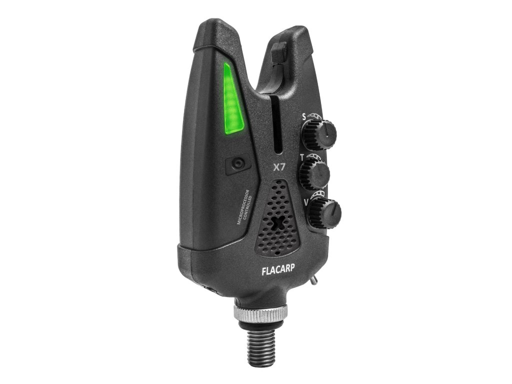 Nový špičkový signalizátor záběru FLACARP X7, vybavený revolučním ultracitlivým snímačem, reagujícím již od cca 1,5mm potahu vlasce v obou směrech (i padák) s možností regulace délky potahu v širokém rozsahu. Přidali jsme nový rozsah tónů od oblíbeného hlubokého „kvákání” až po vysoké tóny s plynulou regulací hlasitosti. A nechybí ani oblíbená optická signalizace s možností nastavení barvy a jasu RGB LED. A k tomu všemu extrémní mechanická odolnost a bezstarostné napájení běžnými tužkovými články AAA.