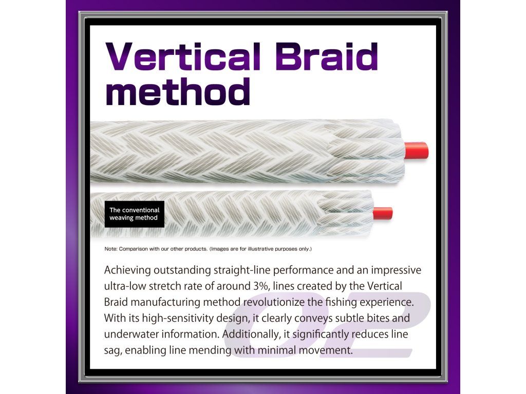 Výrobní metoda Vertical Braid napomáhá k dosažení dokonalého kontaktu s nástrahou. Šňůry vyrobené touto technologií dosahují ultra nízké míry roztažnosti kolem 3 % a výrazně tak zintenzivňují zážitek z rybolovu. Výjimečně rychlé potopení šňůry napomáhá vytvoření lineární trajektorii mezi špičkou prutu a nástrahou, což výrazně snižuje „prověšení vlasce“ a zvyšuje citlivost a lepší kontakt s nástrahou.
