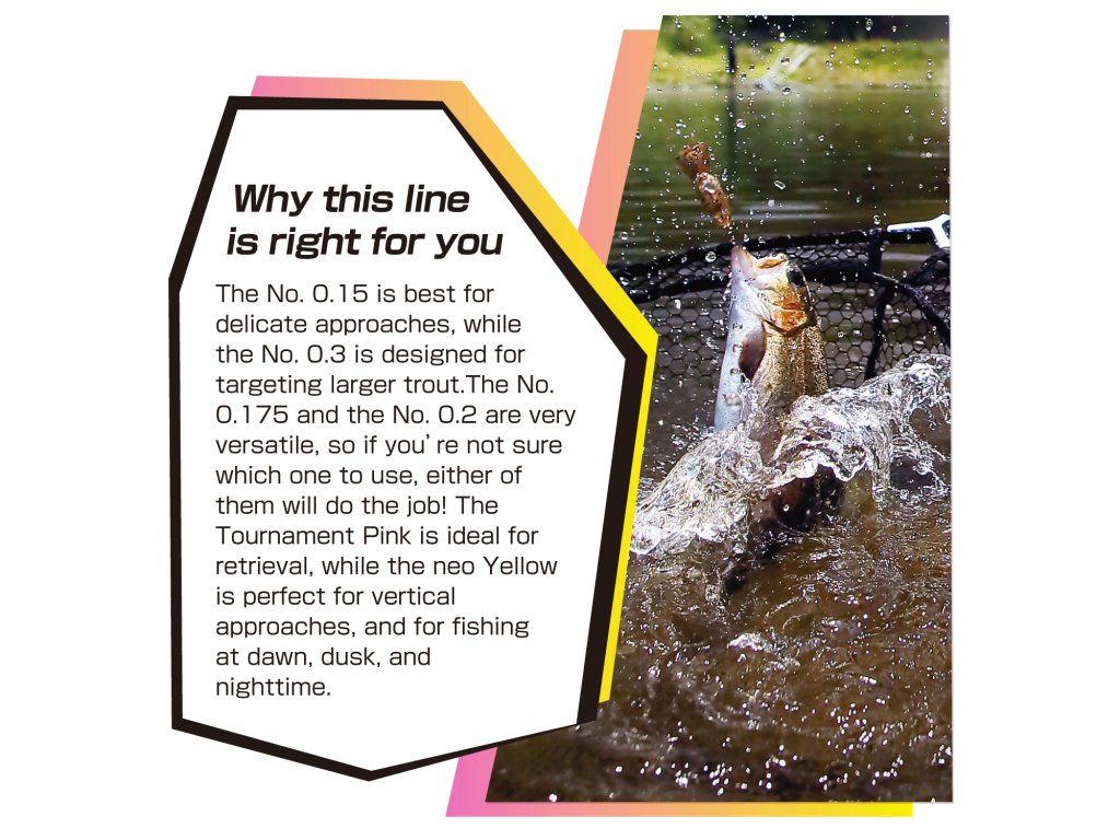Průměr #0,15 je vhodný pro co nejjemnější lov, zatímco #0,3 je určen pro cílený lov velkých pstruhů. Průměry #0.175 a #0.2 jsou univerzální volbou, vhodnou bez ohledu na velikost lovených ryb. Barva Tournament Pink je vhodná pro klasické styly vedení, zatímco Neo Yellow je ideální pro vertikální techniky (bottom fishing) a pro rybaření za zhoršených světelných podmínek.