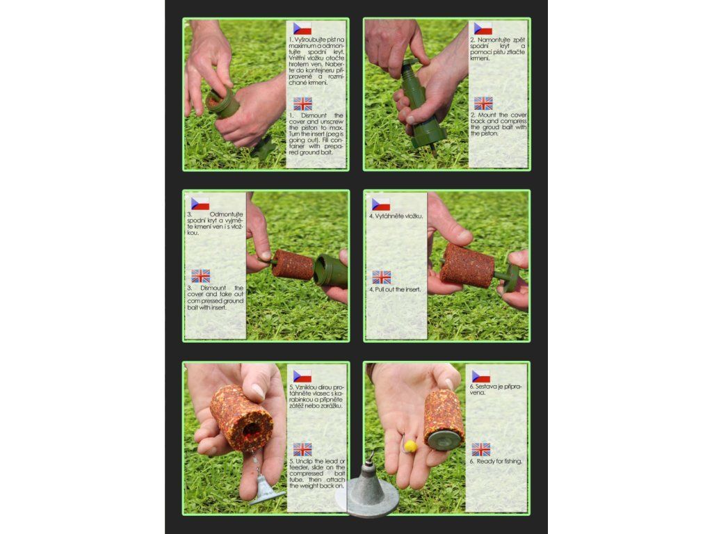 Ground Bait Compressor lze použít na zakrmovací směsy, měkké pelety nebo partikly. Compressor umožňuje tvorbu válečků s dutým jádrem, které pak lze zavěsit na sestavu. Odpadá i nutnost použití PVA materiálu. Tam kde by vlhkost PVA materiál rozpustil lze použít stlačené válečky z Ground Bait Compressoru.