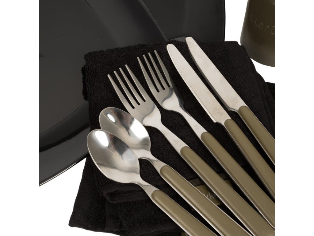 Obsahuje dva nože, dvě vidličky, dvě polévkové lžíce, dva čtvercové talíře, dva hrnky, dvě zelené dózy Glug (ideální pro uložení čaje, kávy, cukru nebo koření) a dva utěrky. Všechno na svém místě!