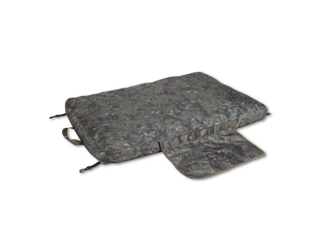 Váš úlovek lze umístit i na vnější vrstvu odháčkovací podložky, nebo jí lze odepnout a použít pro přikrytí úlovku. Dodává se s velkou odnímatelnou podložkou pod kolena, která může sloužit jako praktický úložný vak například pro váhu nebo další produkty péče o kapry.