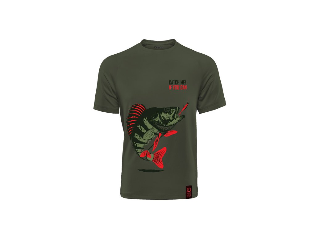 Série stylových a pohodlných triček s vyobrazením ryb, vhodných nejen na ryby, ale také k běžnému nošení. CATCH ME IF YOU CAN (Chyť mě, pokud to dokážeš) se nepochybně stane jedinečným kouskem každého rybářského šatníku, díky kterému se u vody odlišíte. Tričko Catch me! OKOUN je designované v tmavě zelené barvě s vyobrazením okouna, který se právě blíží k nástraze, což je moment, na který čekají všichni příznivci lovu těchto ryb. Samotné tričko je vysoké kvality, stejně jako použitý barevný tisk. Nabízíme je v široké škále velikostí od S až po KING SIZE (ekvivalent 4+XL, který je ve většině zemí označován jako XXXXXL). Model King size tedy hravě oblékne i ty nejstatnější rybáře o hmotnosti 135kg+. Složení: 100% bavlnaDoplňkové parametry