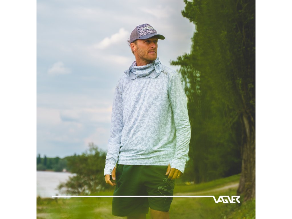 Tričko UV skin má UPF ochranu 50+, reflexní prvky i speciální ochranu obličeje – kapuci s připínacím perforovaným tunelem. Motiv sumčí kůže,typický pro celou kolekci VAGNER, je tenotkrát světlý; to aby ti v něm nebylo horko.