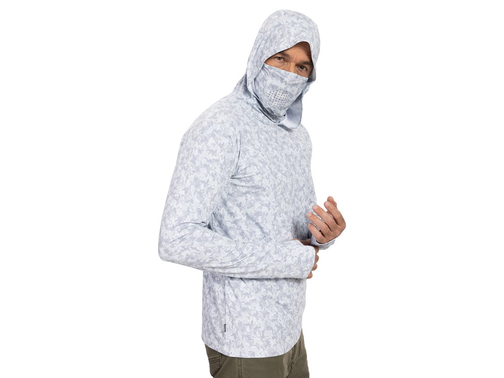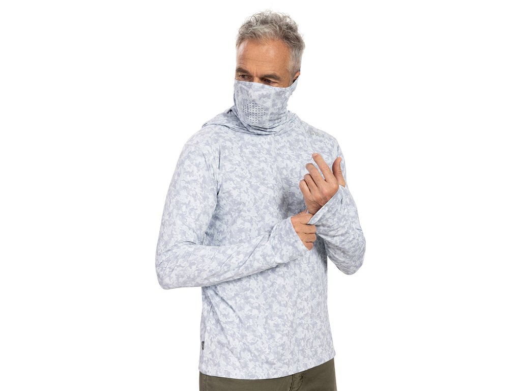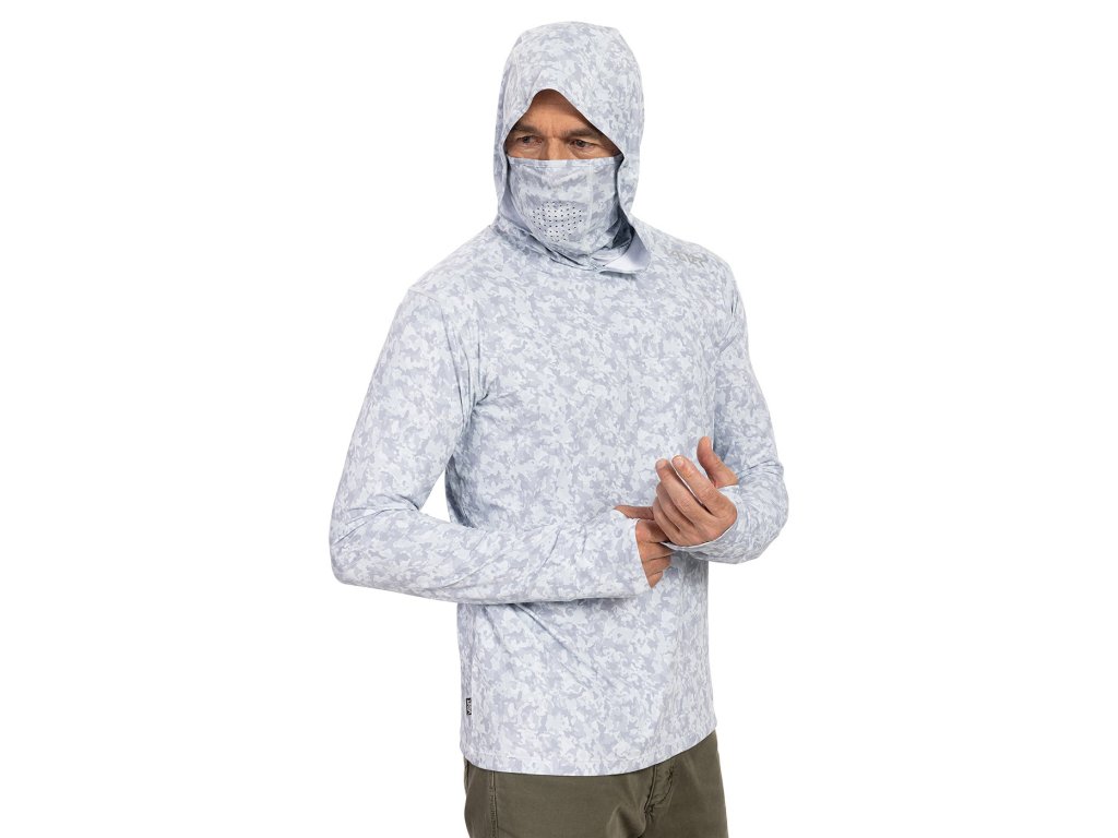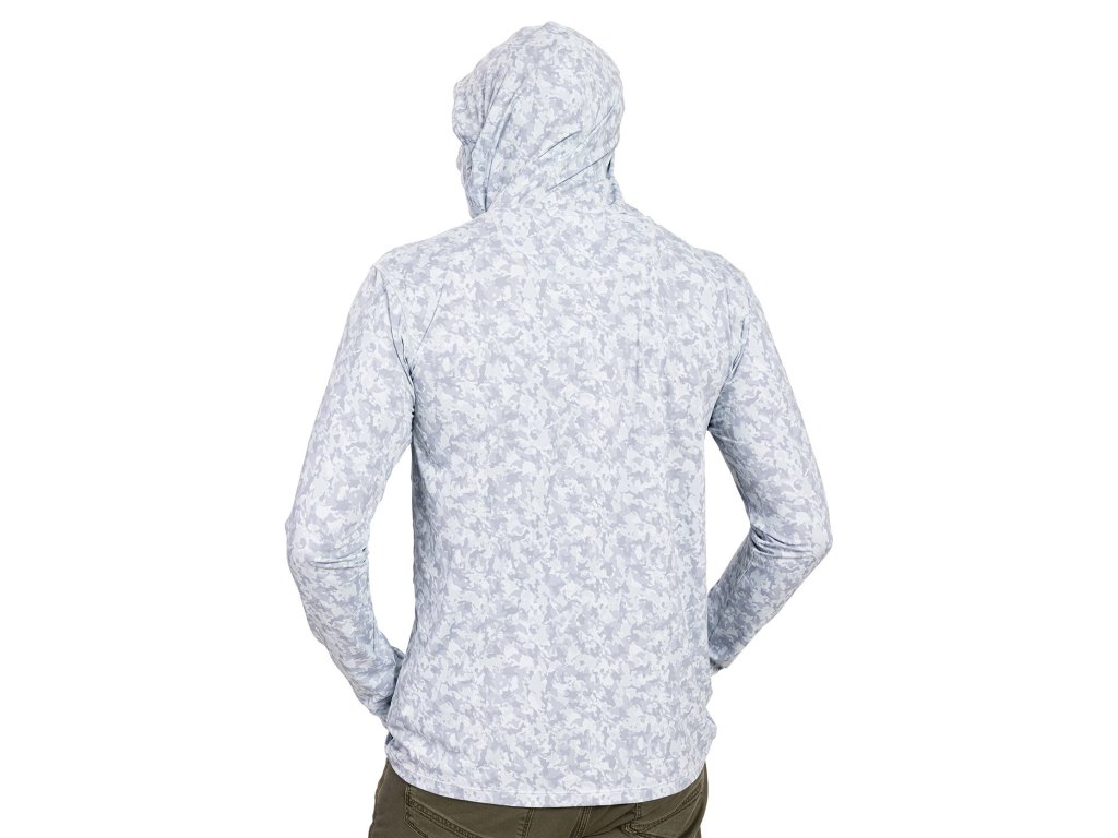 Tričko UV skin má UPF ochranu 50+, reflexní prvky i speciální ochranu obličeje – kapuci s připínacím perforovaným tunelem. Motiv sumčí kůže,typický pro celou kolekci VAGNER, je tenotkrát světlý; to aby ti v něm nebylo horko.