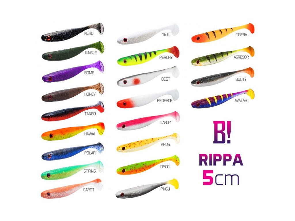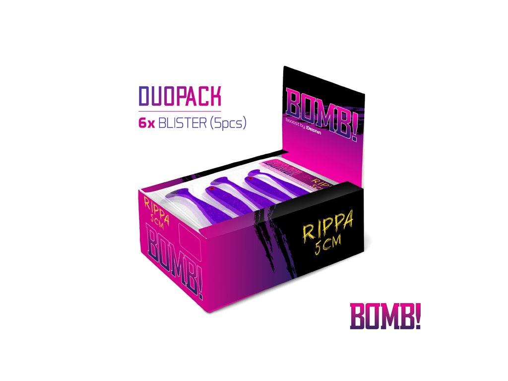 Tento produkt je prodáván ve speciálním balení, navrženém našimi designéry. Samotné nástrahy jsou baleny po 5ks v inovativním blistru Duopack. Jeho největší výhodou je, že ho v prodejně buď klasicky zavěsíte a prodáváte nástrahy po 5ks, nebo jednoduše složíte jeho vrchní část a zůstane vám vanička, ze které můžete nástrahy prodávat i po 1 kuse. To umožní prodávat nástrahy ve vašem obchodě tak, jak vám to nejvíce vyhovuje a nemusíte se více rozhodovat, zda je vhodnější klasický blistr nebo vanička. Při zakoupení 12 ks balení stejné délky a barvy dostáváte navíc plno barevný prezentér, který ještě zvýrazní atraktivitu tohoto produktu pro vaše zákazníky! Nejvyhledávanější tvar umělé nástrahy s velmi širokým spektrem použití, kompletně navržený týmem slovenských designérů a přívlačářů. Díky svému tvaru rybka dokonale napodobuje nejoblíbenější potravu dravců našich vod. Její pohyb ve vodě je dokonalý ze dvou důvodů: 1. Správné tvarování a bezchybný poměr proporcí těla 2. Odlití těla nástrahy ze směsi té nejvyšší kvality Rybka má po celém těle jemnou strukturu a v páteřní části zářezy, díky kterým si můžete jednoduše vyměřit bod, kudy vést jigový háček, aby jeho osazení bylo dokonalé. Tužší tělo a ultra jemný ocásek ve vodě neustále kmitají a dokáží tak vyprovokoval útok i těch nejopatrnějších dravců. Navíc jsou součástí rybky i 3D oči, které napomáhají k ještě důvěrnějšímu imitování přirozené nástrahy. BOMB! Rippa nabízí širokou škálu těch nejúčinnějších barevných vyhotovení, která byla vybrána na základě dlouhodobých testů na vodních plochách po celé Evropě. Hmotnost nástrahy: 0,8gDoplňkové parametry