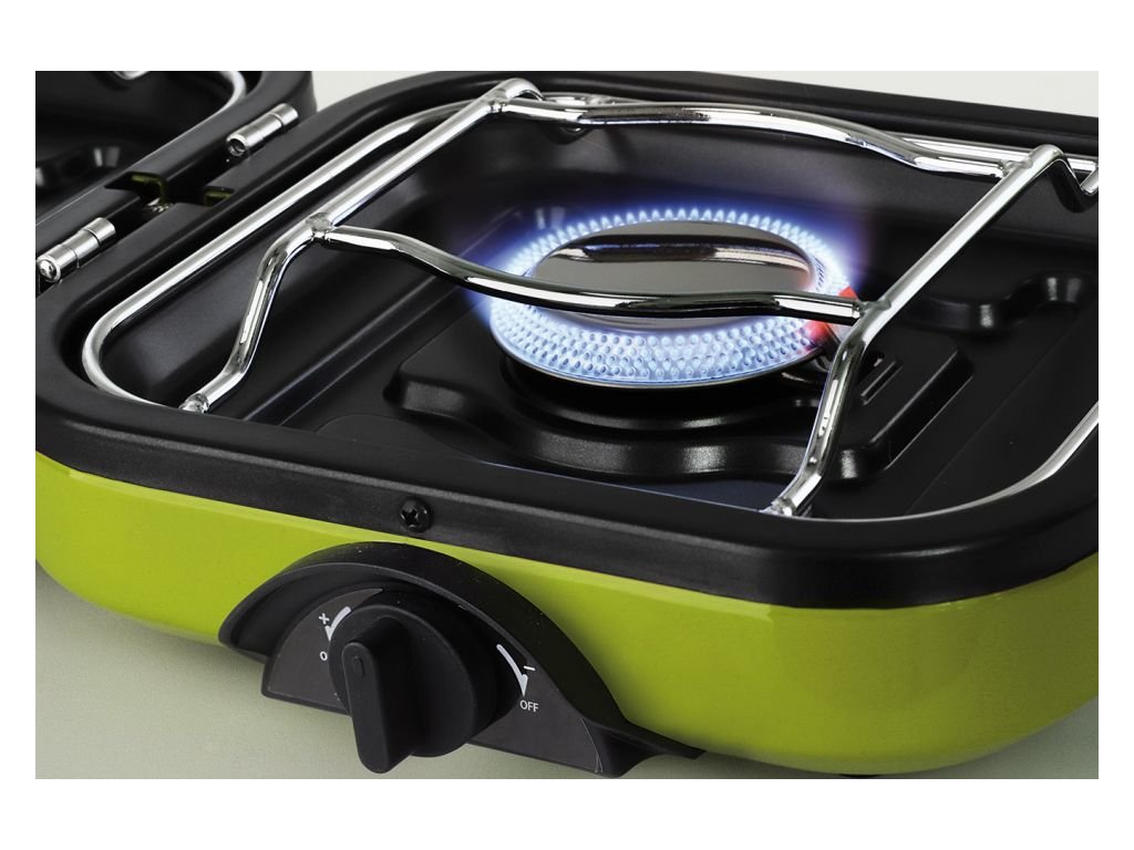 Vařič je vybaven dvěma hořáky (výkon 2 x 2,3 kW) s možností složení vařiče pro zajištění kompaktnosti a snadného přenosu.