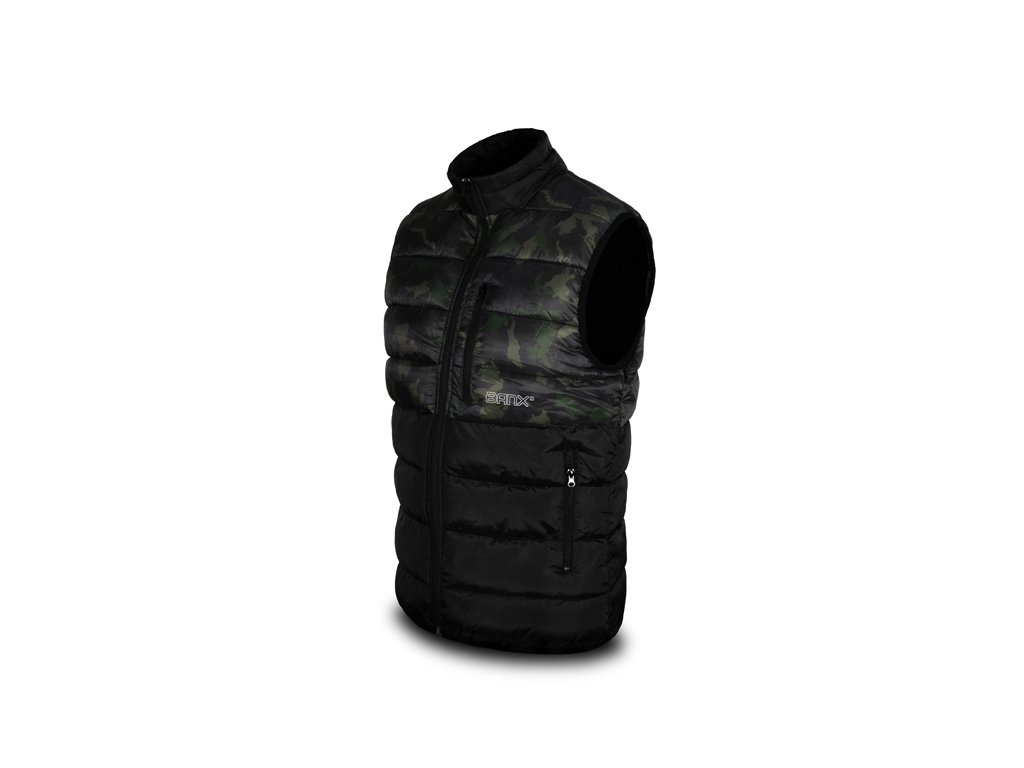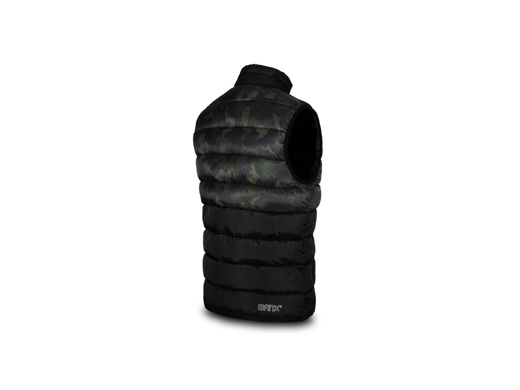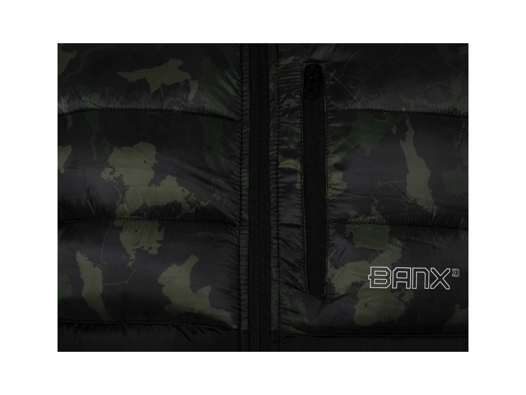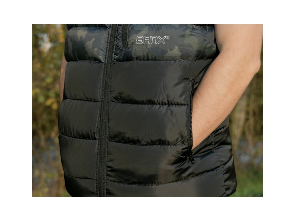 Zateplená vesta přinášející skvělý tepelný komfort během chladných, podzimních či zimních dní. Je vyrobena z tkaniny, která je příjemná na dotek a zároveň snadno udržovatelná, což je velmi praktické při použití během rybolovu a jiných outdoorových aktivitách. Vesta je zároveň příčně prošívaná, což vytváří stylový vizuální prvek produktu. Výplň vesty je extra lehká a zajišťuje výborné termoizolační vlastnosti. Zapínání je zajištěno pomocí kvalitního zipu, překrytého z vnější strany tkaninou, což zvyšuje jeho odolnost vůči vnějším podmínkám. Na obou stranách se nacházejí dostatečně velké kapsy na ruce nebo pro odložení potřebného příslušenství. Vesta Banx disponuje také vyvýšeným límcem pro lepší překrytí krku a šíje při nízkých teplotách vzduchu. Design se skládá z černé barvy, kterou stylově doplňuje naše patentovaná kamufláž BANX. Díky této kombinaci ji můžete využít nejen při rybolovu, ale také k běžnému nošení. Podle přiložené velikostní tabulky si prosím zkontrolujte vyhovující velikost. Materiálové složení: 100% Polyester Pojem BANX vyjadřuje patentovanou kamufláž z dílny značky Delphin, která v sobě nese hluboký vzkaz. Jedinečné designové prvky, ze kterých je složená, jí dodávají nezaměnitelný charakter a dělají z ní více než jen vizuální vzor. Kamufláž BANX zobrazuje přesně to, co spojuje naši rybářskou vášeň napříč celou Evropou. Jsou to jezera, řeky či jiné vodní plochy. Od vod rumunského pobřeží, přes vodní nádrže na Slovensku až po ikonická jezera Evropy napříč Německem, Itálií až po úplný západ Evropy ve Španělsku. Právě siluety těchto jezer jsme spojili a vytvořili tak jedinečnou kamufláž s názvem BANX. Není to jen kamufláž - je to mapa. Mapa, která svým precizním designem zobrazuje ty nejznámější revíry Evropy, díky nimž bude vaše výbava vypadat maximálně jedinečně a originálně.Doplňkové parametry