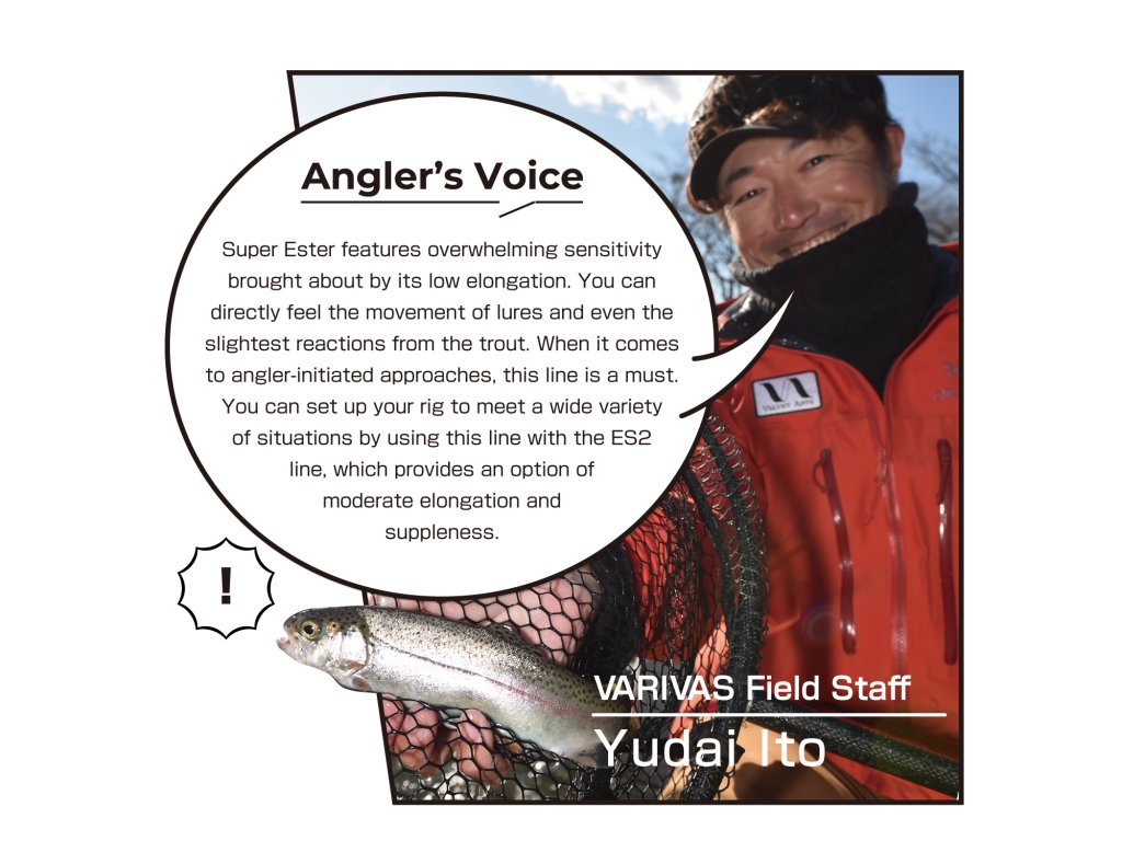 Speciální vlasec od japonské značky Varivas pro Trout Areu. Hlavní předností esterových vlasců je jejich velmi malá průtažnost, díky které máte s nástrahou kontakt téměř jako za použití pletené šňůry. I při lovu na velkou vzdálenost cítíte každý záběr, každé brnknutí nástrahy o dno. Díky specifické hustotě 1,35 je ester vynikající pro lov s malými nástrahami, kdy na rozdíl od šňůry mnohem lépe a plynuleji propadá vodním sloupcem a tím nenarušuje jejich chod a zároveň nedochází k přiliš rychlému vytažení nástrahy z požadované hloubky. Maximálně tedy vlastnosti esteru využijete při lovu opatrných pstruhů na stojatých vodách na malé plandavky, woblery nebo při bottom fishingu, kdy nástraha propadává vodním sloupcem. Díky povrchové úpravě technologií SP-V se s ním snadno nahazuje na velké vzdálenosti, zároveň je chráněn proti UV záření, což výrazně prodlužuje jeho životnost. Tento speciální vlasec je předurčen pro lov pstruhů na plandavky, ale vynikající bude i při lovu s malými woblery.