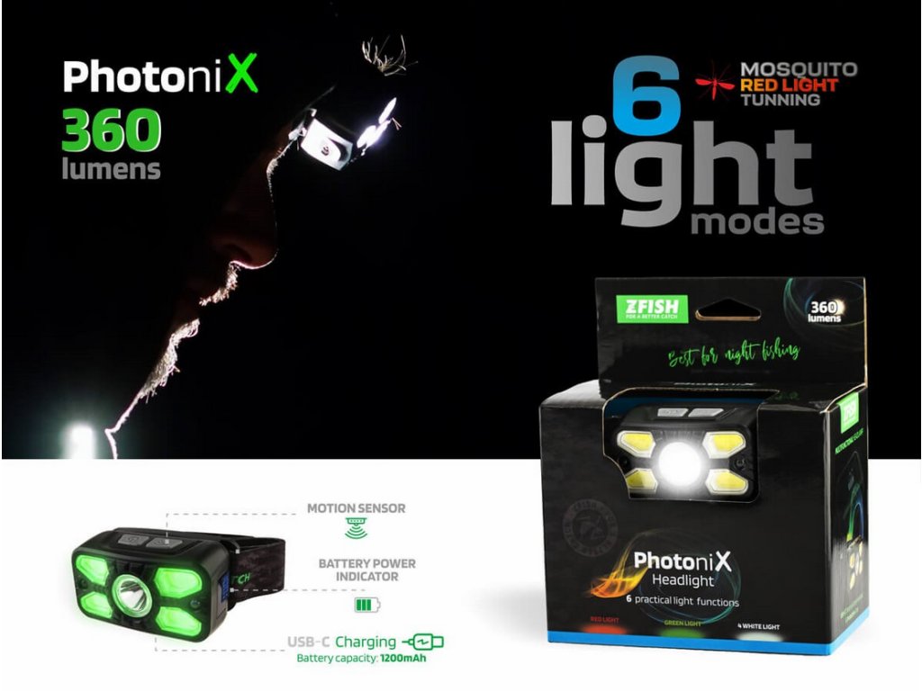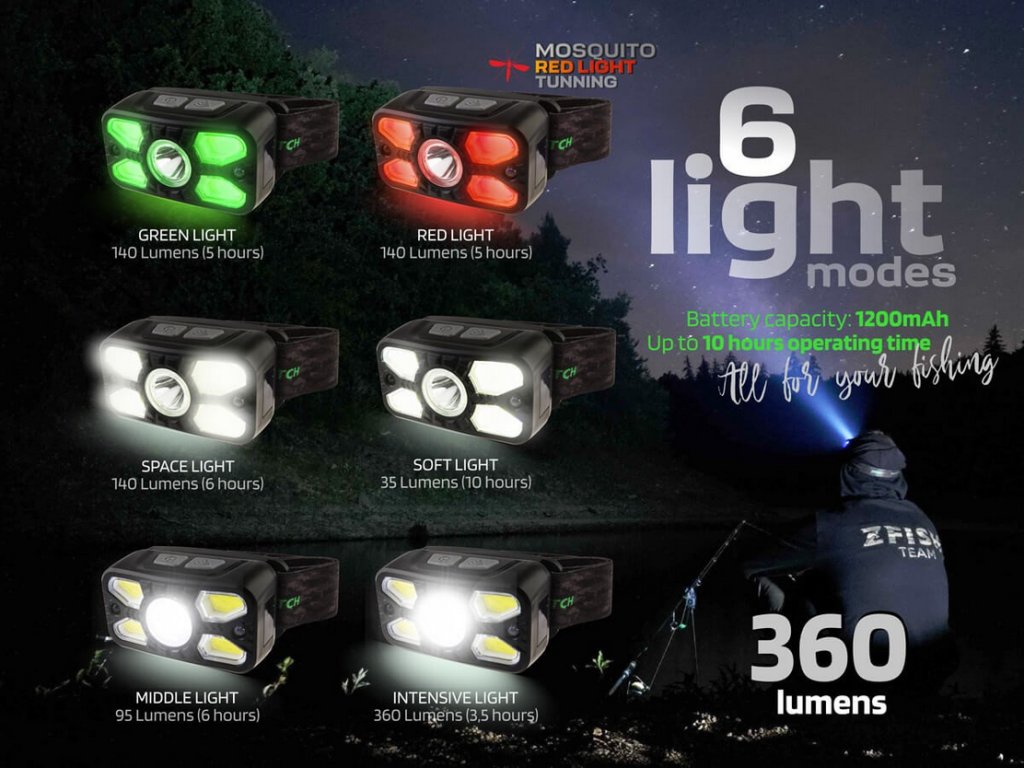 Při vývoji našich čelovek jsme se zaměřili na pět klíčových vlastností, které považujeme za zásadní pro noční rybolov. Lehká váha čelovek je důležitá pro komfort. Díky praktickým a hlavně pro rybáře velmi potřebným funkcím nabízejí širokou škálu světelných režimů pro různé situace u vody – od ostřejšího kužele přes rozptýlené světlo až po ambientní režim, tak aby splňovali požadavky i pro extrémní rybaření. Všechny modely jsou samozřejmě vybaveny zeleným a zejména červeným světlem Mosquito Red Light Tuning, které jsme optimalizovali na vyváženou vlnovou délku. Mosquito Red Light Tuning zajišťuje na jednu stranu velmi dobrou noční viditelnost, na druhou stranu, oproti jiným čelovkám tohoto typu, je upravená světelná frekvence tak, aby maximálně eliminovala přitahování obtížného hmyzu, komárů apod. Nechybí ani další praktické funkce, jako je paměťový režim pro automatické zapnutí posledního nastavení světelného módu, indikátor stavu baterie nebo pohybový senzor pro bezdotykové ovládání. Díky své minimální hmotnosti a nastavitelnému elastickému popruhu se čelovka velmi pohodlně nosí – téměř zapomenete, že ji máte na hlavě.