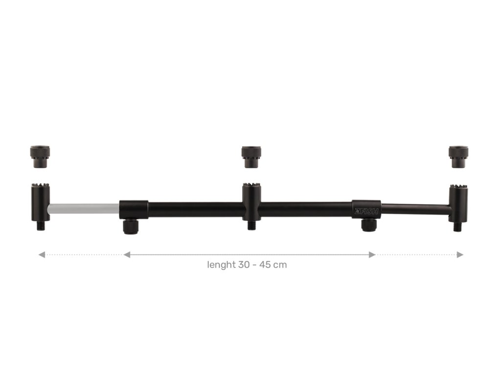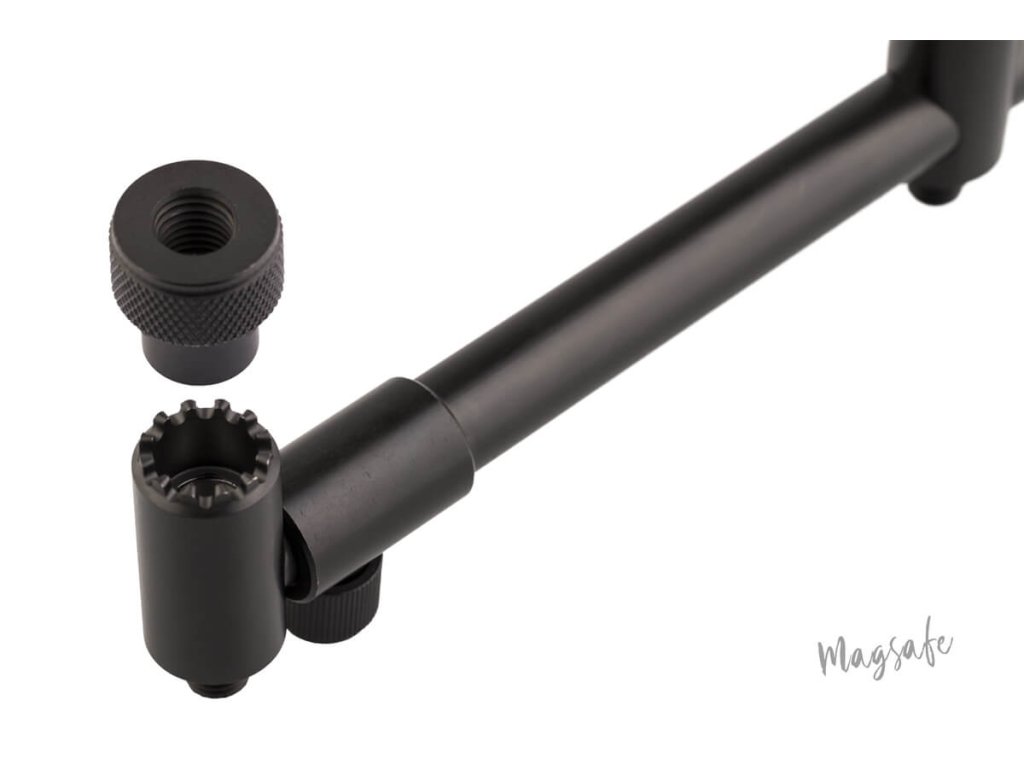 ZFISH Magsafe Buzzer Bar 3 Rods je velice precizně zpracovaná, kvalitní a pevná hliníková hrazda v černém matném provedení. Velkou výhodou této hrazdy jsou integrované magnetické adaptéry/rychlospojky k hlásičům, které Vám velice usnadní montáž a demontáž hlásičů. Další výhodou je teleskopicky nastavitelná šíře 31-45 cm a navíc hrazdu lze ukotvit k zemi pomocí jedné, dvou nebo tří závitových vidliček. Díky tomu již nepotřebujete žádný kotvící kříž a nemusíte mít obavy, že se vám hrazda bude protáčet při prudkém záběru.