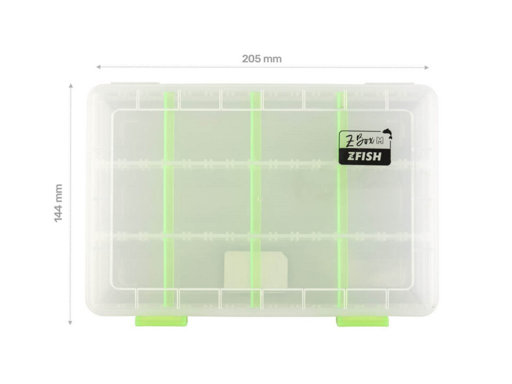 ZFISH Krabička Z-Box M je klasická, univerzální, průhledná krabička/tackle box od české značky ZFISH. Tento organizér disponuje dostatečným prostorem a přihrádky si přizpůsobíte dle potřeby pomocí vyjímatelných přepážek. Bezpečné uzavírání, nebo nechtěné otevření zajišťují dva zavírací klipy.