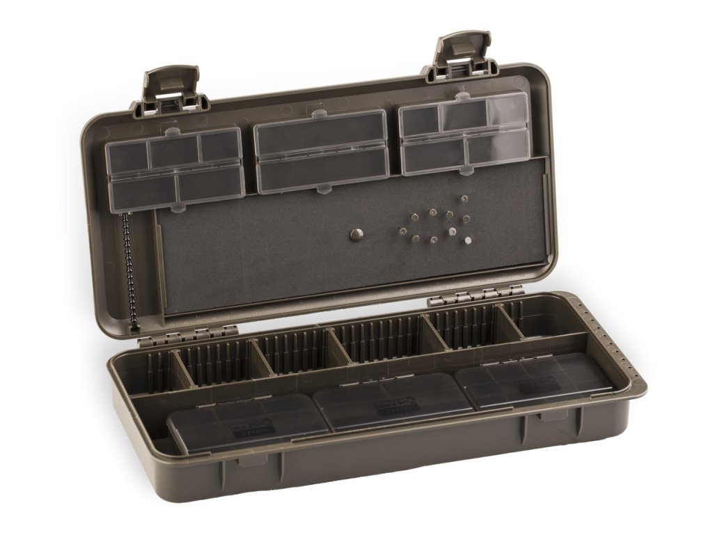 ZFISH Z-Box PRO 38 je praktický a univerzální tackle box od české značky ZFISH. Tento šikovný organizér je kompaktnější verzí modelu PRO 45 a disponuje 38-mi přihrádkami z nichž většina je nastavitelná díky vyjímatelným přepážkám. Bezpečné uzavření a nechtěné otevření zajišťují dva bytelné aretační klipy. Víko organizéru je opatřeno robustními, uzavíratelnými přihrádkami a dále nabízí kompletní zásobník na návazce s hrazdou pro háčky, pěnovou částí o velikosti 270 x80 mm a 10-ti kusy špendlíků a integrovaným pravítkem. Další vychytávkou u tohoto konkrétního modelu tackle boxu je integrovaná děrovaná lišta pro zavěšení hotových montáží umístěná na jedné z kratších stran spodní části boxu. Celkové rozměry boxu jsou 350 x165 cm s hloubkou 50 mm, takže spolehlivě pojme drobnou bižuterii včetně pomůcek pro samotné vázání návazců a montáží, jako jsou nůžky, kleště, jehly, utahovače uzlů apod. Nadstandardní výbavou tohoto pořadače jsou další 3 menší samostatné krabičky o velikosti 102 x 80 x 24 mm s 4, 6 a 8-mi přihrádkami. Jednoduchý a čistý design se zkosenými a oblými hranami nejen skvěle vypadá, ale díky oblým tvarům je i samotná manipulace mnohem příjemnější. Celkově výborný dojem už jen podtrhují odolné materiály, jednotlivé komponenty ve velmi elegantním, temně olivově zeleném provedení. Tento organizér využijete při většině rybolovných technik, především však při kaprařině a feederu.