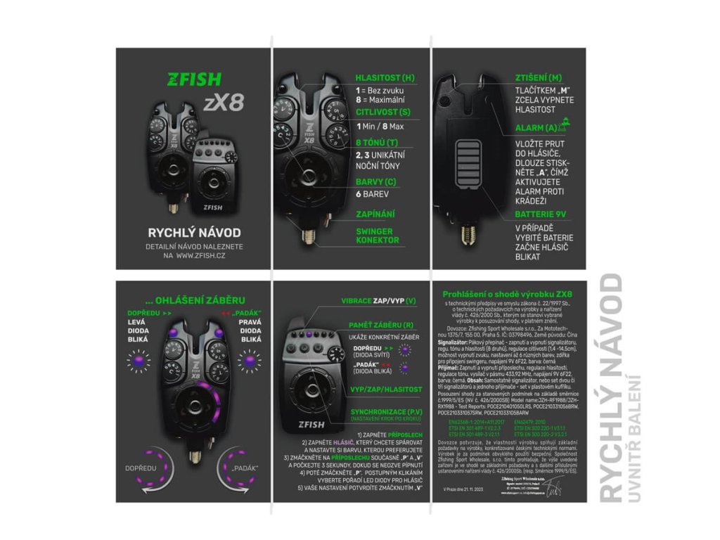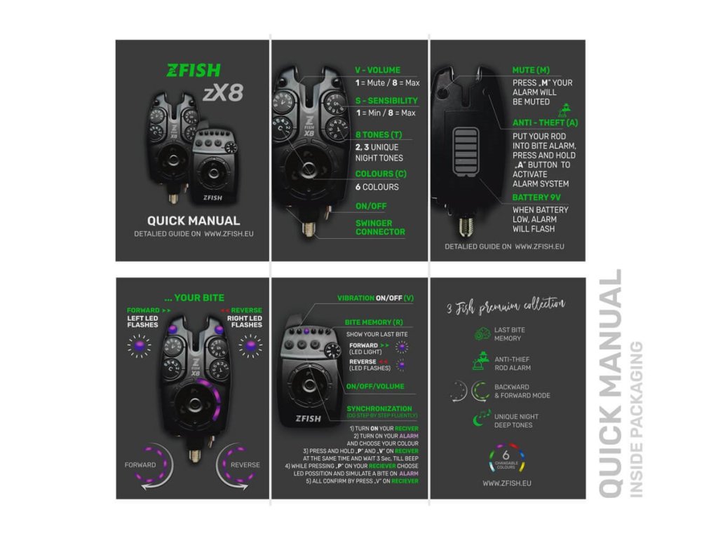 ZFISH Bite Alarm Zx8 je nepochybně naše nová vlajková loď mezi hlásiči. Při vývoji a navrhování těchto hlásičů jsme kladli důraz na odstranění všech běžných nešvarů a můžete si být jistí, že tyto hlásiče jsou skutečně “vymazlené” do posledního detailu, zkrátka hlásiče nové generace. Zx8 disponují 6-ti barvami a dokonce 8-mi zvukovými tóny ( z nichž 2 jsou zcela unikátní hluboké tóny speciálně navržené pro noční rybolov ) a navíc jsou opatřeny alarmem proti krádeži. Další užitečnou funkcí je paměť záběrů, která vám umožní zjistit zda jste měli “jízdu” (záběr vpřed ), nebo takzvaný “padák” ( zpětný záběr směrem k vám ). Samozřejmostí jsou vibrace příposlechu a snadné nastavení celkové citlivosti a hlasitosti. Zx8 byly testovány v extrémních podmínkách, takže za jejich odolnost proti vodě a prachu, můžeme dát ruku do ohně a navíc bezproblémů fungují až na vzdálenost 200m.