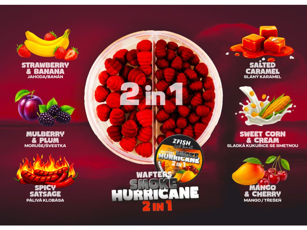 Hurricane wafters představuje jedinečnou nástrahu s výrazným provedením, která vytváří ve vodě velmi silný vizuální i pachový signál. Při kontaktu s vodou se uvolňuje atraktivní barevný mrak doplněný o intenzivní aroma osvědčených příchutí, což ryby dokáže přilákat i z větší vzdálenosti. Velkou výhodou této nástrahy je, že každé balení obsahuje dvoubarevné provedení nástrahy ve velikosti 8mm a 10mm. Díky tomu můžete snadno reagovat na aktivitu ryb, velikost cílových ryb i styl prezentace. Výborně se hodí především pro method feeder, feeder i lov s klasickým krmítkem. Skvěle fungují při krátkodobých vycházkách, závodech, slabé aktivitě ryb nebo při lovu velmi opatrných jedinců, kdy rozhodují detaily v prezentaci. Jsou ideální volbou pro rybáře, kteří chtějí mít k dispozici maximálně atraktivní nástrahu s vysokou flexibilitou použití.